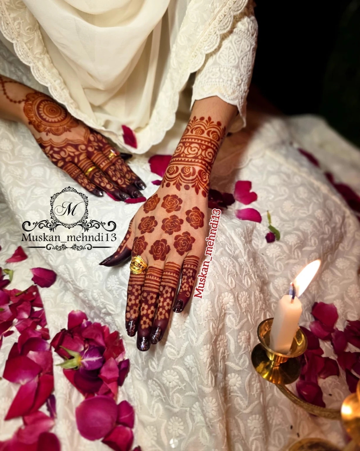 Minimal Floral Mehndi is all about subtle elegance and clean artistry. It features delicate flowers, fine leafy trails, and soft vines placed with plenty of open space, creating a light and graceful look. Instead of heavy fills, the focus is on neat lines and balanced motifs that enhance the natural beauty of the hands.